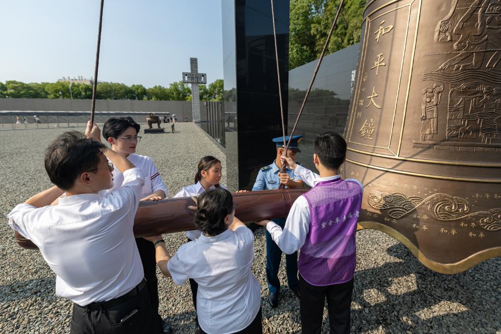 7月7日,各界人士代表在“纪念全民族抗战爆发88周年”仪式现场撞响和平大钟。新华社发(胡潇摄)