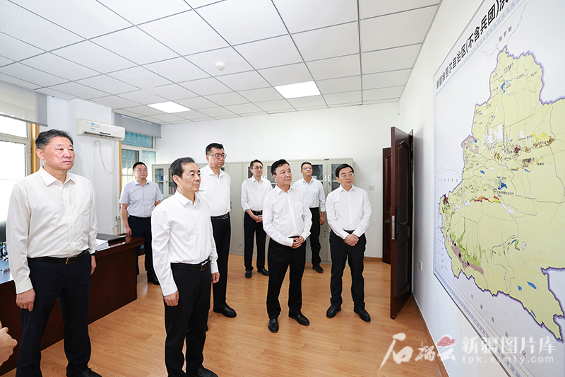 7月16日,自治区党委书记、兵团党委第一书记、第一政委陈小江在自治区应急管理厅防汛抗旱处,听取新疆河流水系和防洪工程分布建设工作介绍。天山网-新疆日报记者 崔志坚摄