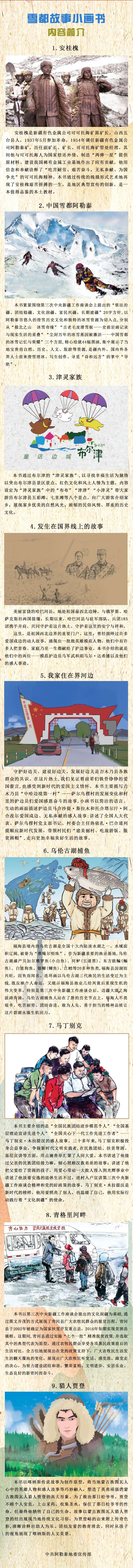 “在延续万年的历史长河中,这片热土上英雄的人民守望相助、勤劳奋进,留下一段段传奇和佳话。我们要把一个个如江河般宽广激荡的故事记录下来、宣传出去,赓续传承红色基因,让雪都故事滚烫?!?019年9月,在地委、行署的高度重视下,地委宣传部启动《阿勒泰主题系列小画书》(后更名为《雪都故事小画书》)策划制作工作,成立领导小组,组建创作团队。为了能够找准选题、实现创作目标,主创团队在100多个选题中精心筛选出9个主题故事。2023年4月,这套“慢出版”的原创精品小画书面世,包括《安桂槐》《中国雪都阿勒泰》《“津灵家族”和魔法——发生在“童话边城”里的故事》《发生在国界线上的故事》《我家住在界河边》《乌伦古湖捕鱼人》《新时代文明实践者——马丁别克·木拉提汉》《青格里河畔的脱贫攻坚故事》《猎人贾登》9册。它们绘制生动精美、内容丰富翔实,既有党性的教益、思想的启迪,又有艺术的熏陶,是面向广大党员群众宣传教育形式的一次创新,也是一套不可多得的外宣精品。