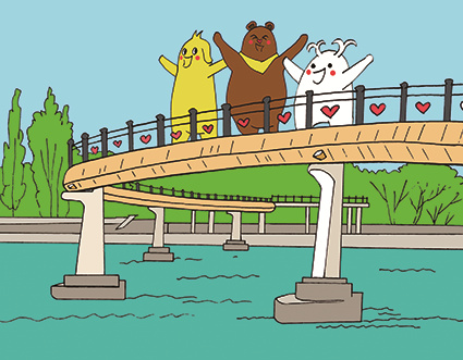 站在桥头,布布、津津和小津灵回想这一天的旅行,感觉收获满满。