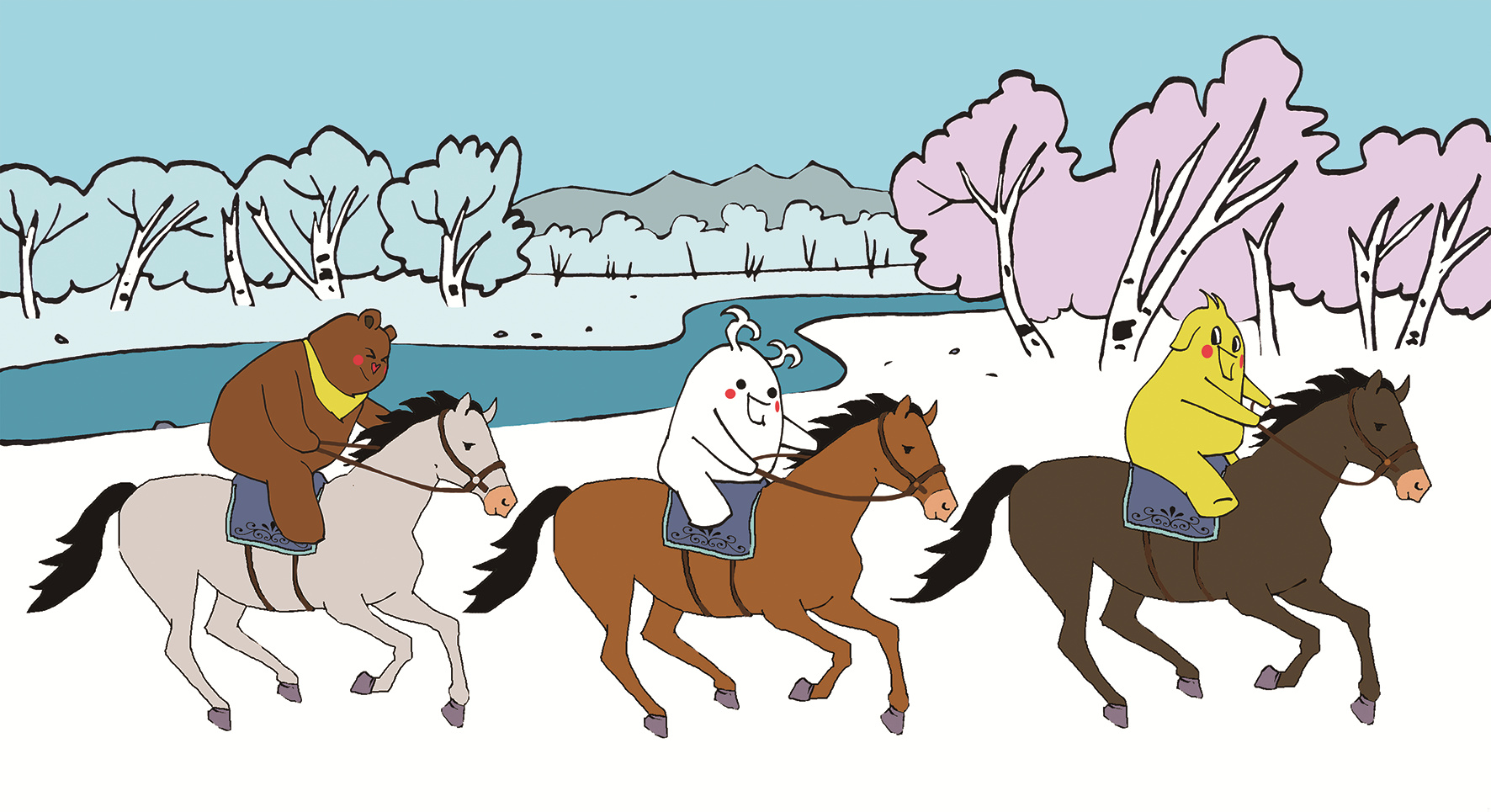 布布、津津和小津灵一起骑马,去“穿越林?!?,去摘最美的精灵冰花。