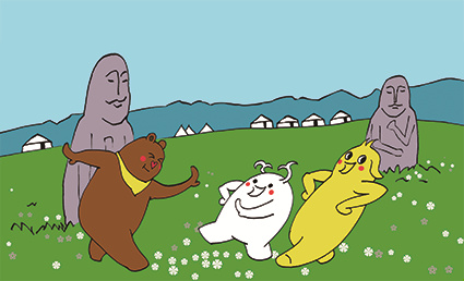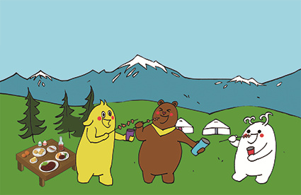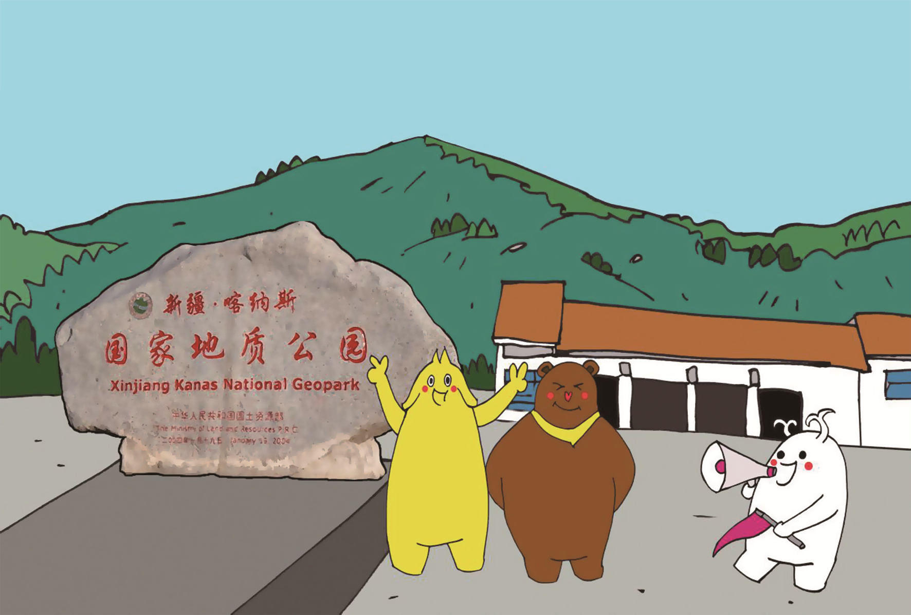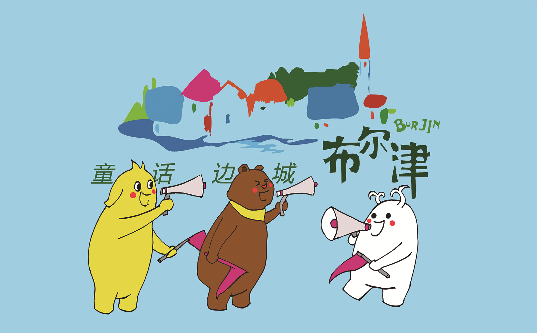 “津灵家族”成员有布布、津津和小津灵。布布是一峰小骆驼,津津是一只小棕熊,小津灵是额尔齐斯河的一朵浪花。
