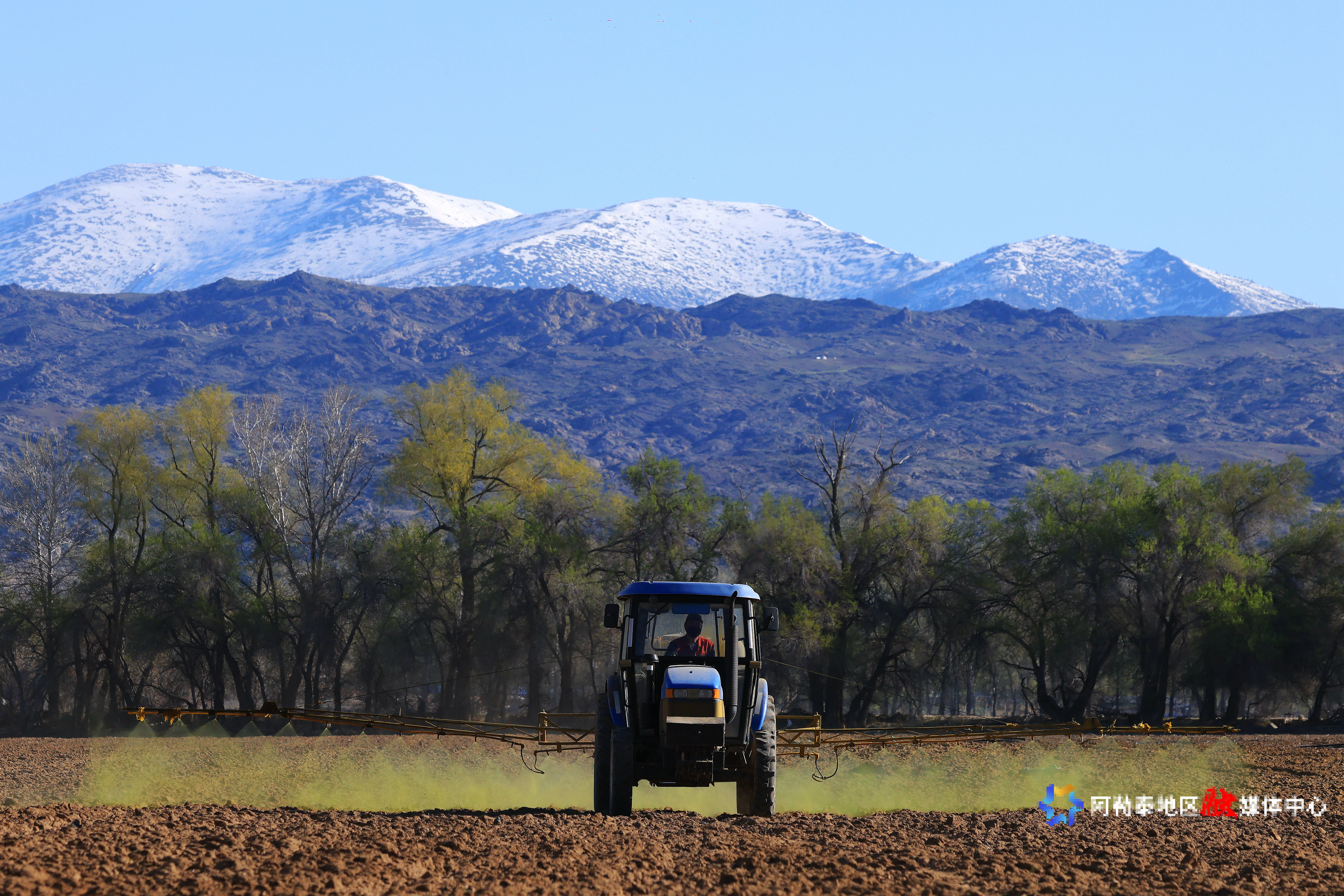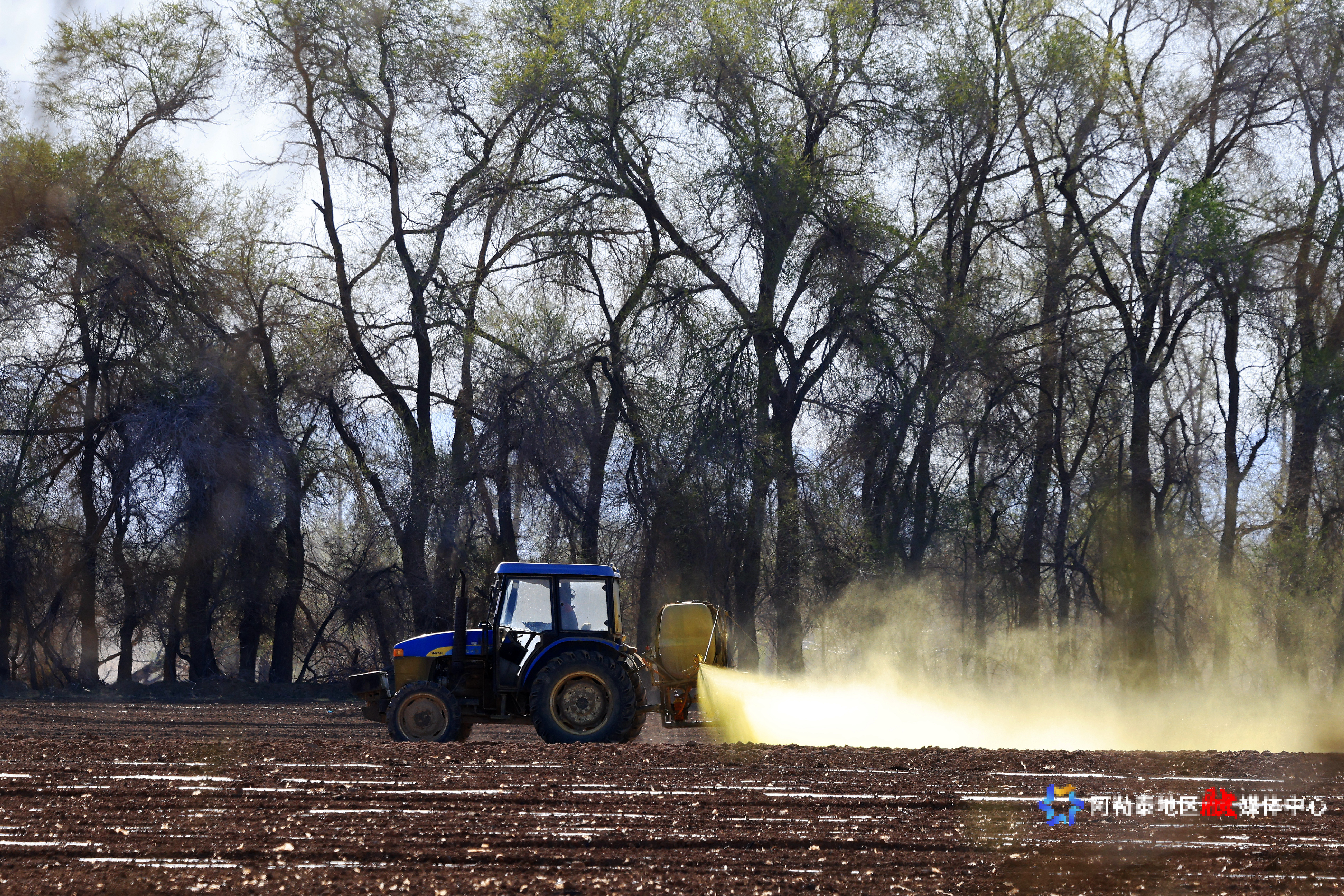 2025年4月27日,在阿勒泰市阿苇滩镇萨斯克巴斯陶村种植户在农田喷洒农药。记者 阿尔达克·拜斯汗 摄
