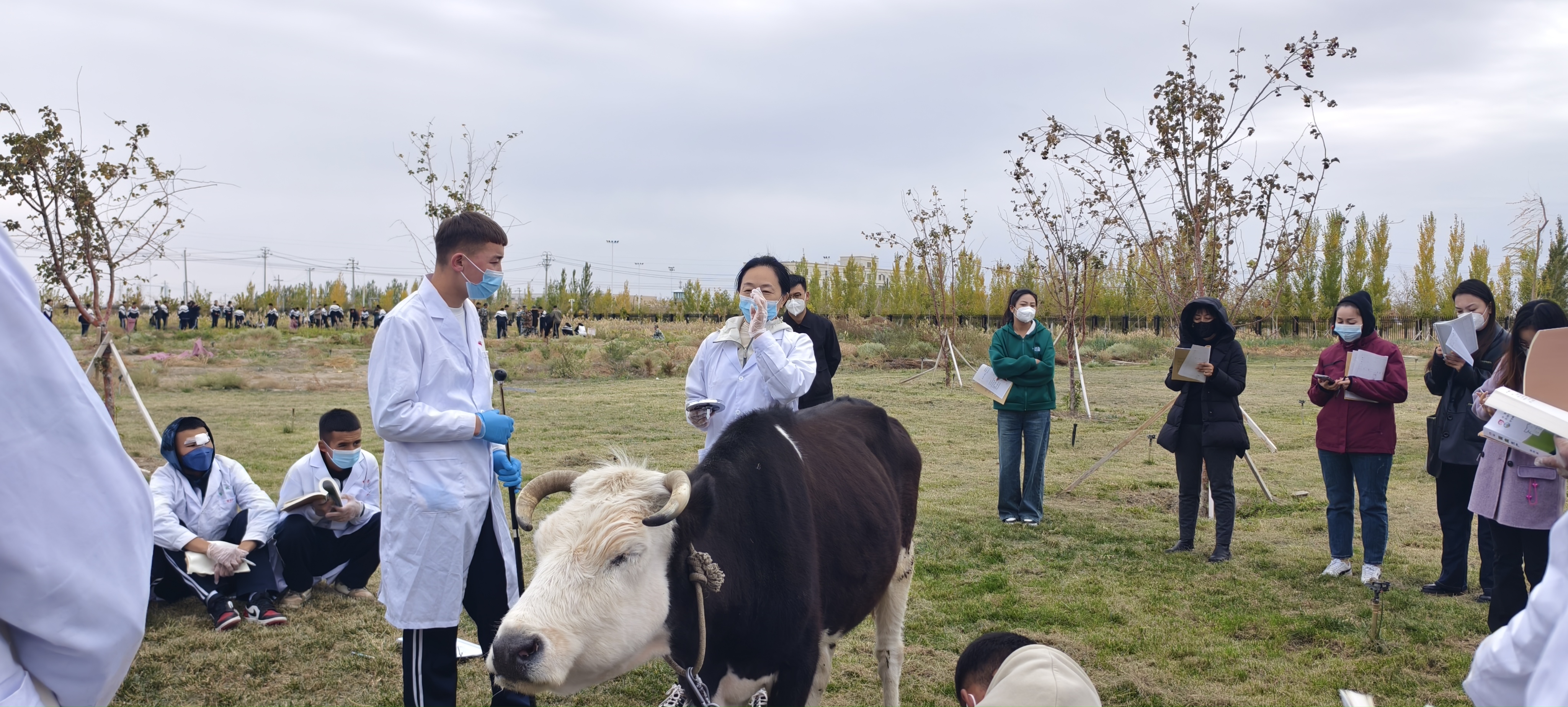 2024年9月,阿勒泰畜牧兽医职业学校援疆教师董桂红正在上实训课“牛外貌鉴定和牛的体尺测量”。(图片由吉林援疆前指提供)