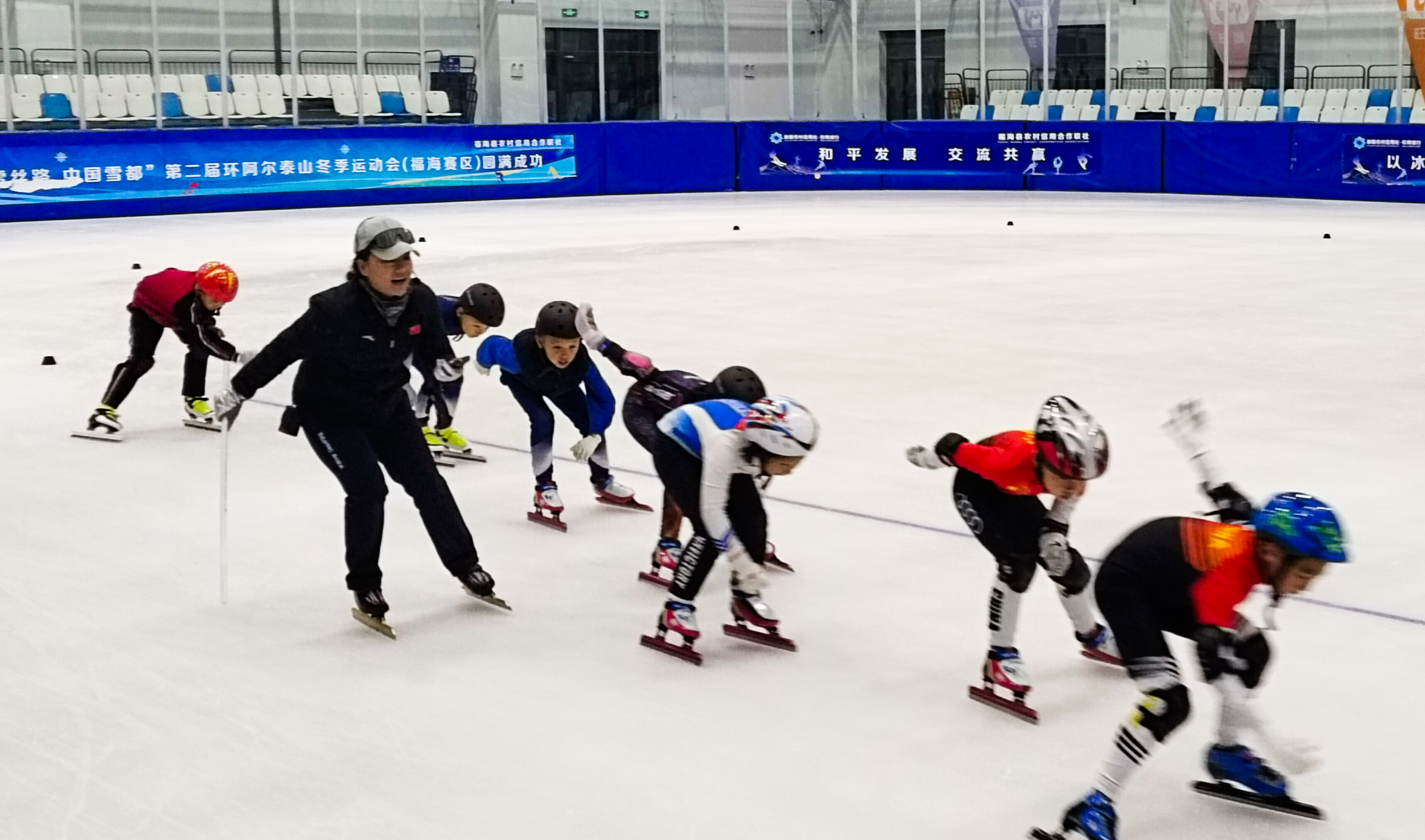 吉林省冰上技术人才张秋爽带领当地少年儿童进行短道速滑训练。(图片由吉林援疆前指提供)