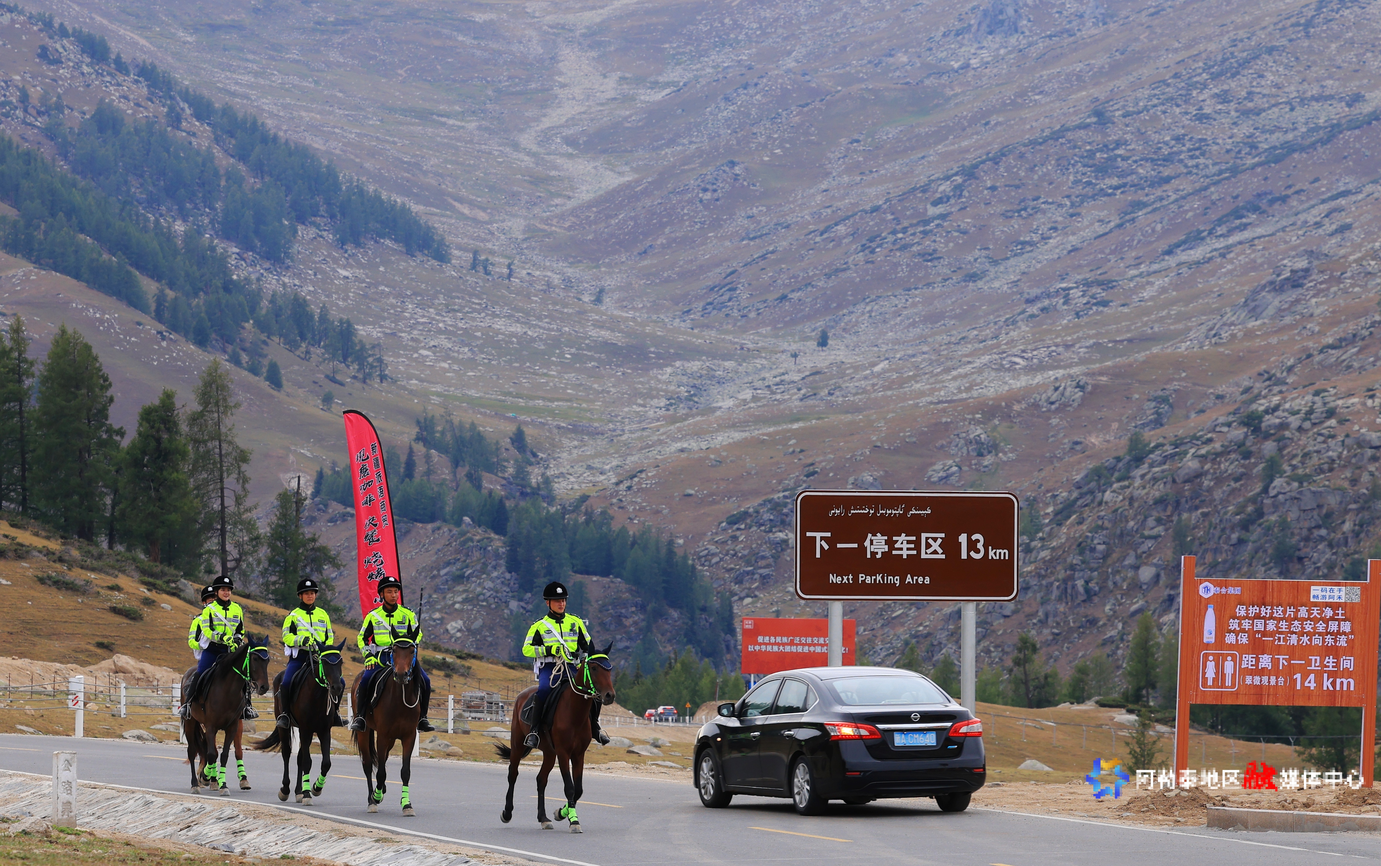 2025年8月15日,阿勒泰市公安局骑警在阿禾公路景区巡逻。记者 阿尔达克·拜斯汗 摄