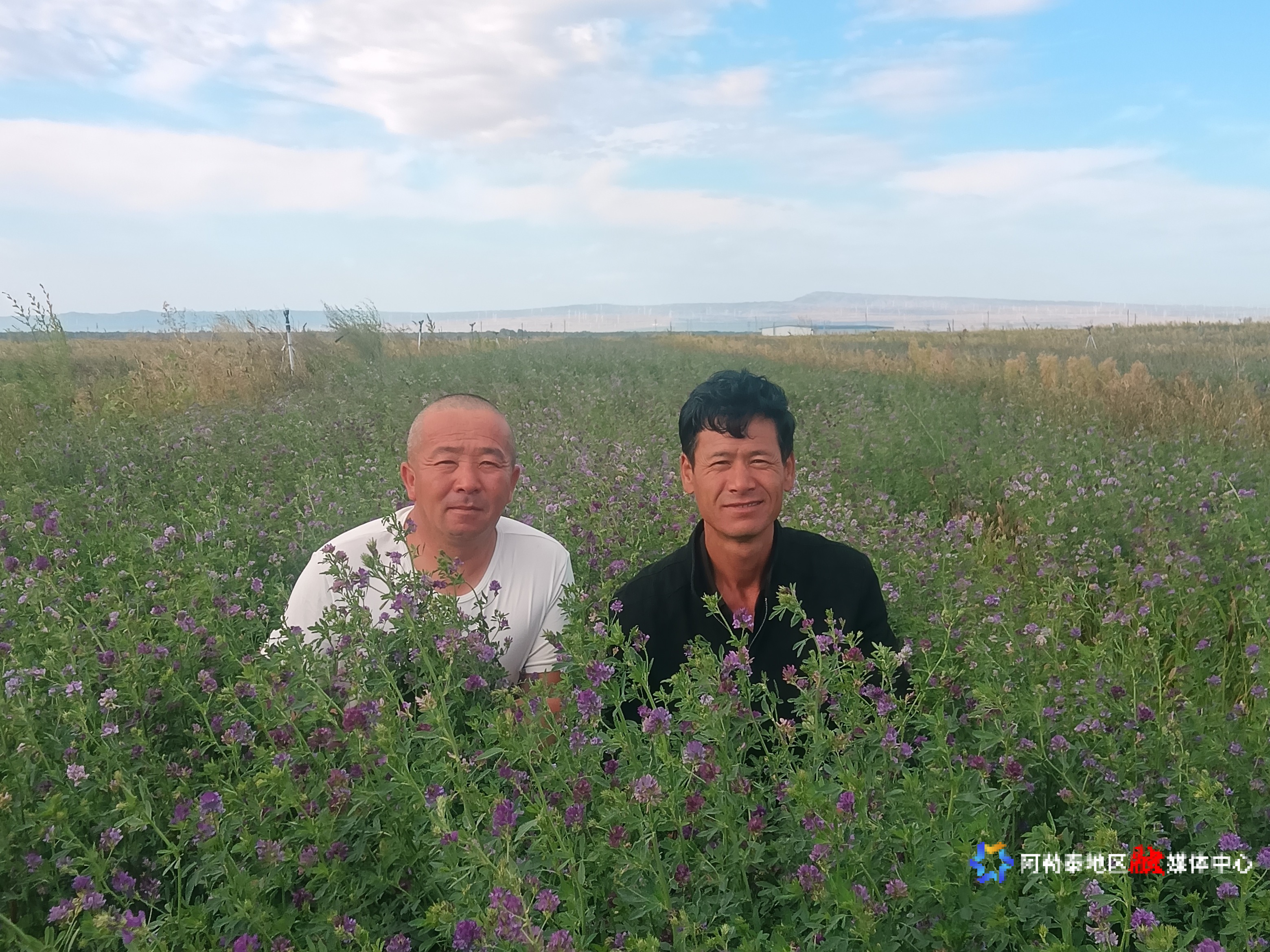 顾耀光和村民在套种的紫花苜蓿田里。右为顾耀光。
