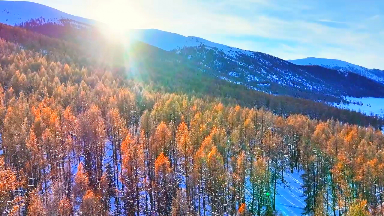 晨光染雪,落叶松燃成阿禾公路最暖的冬日焰色。