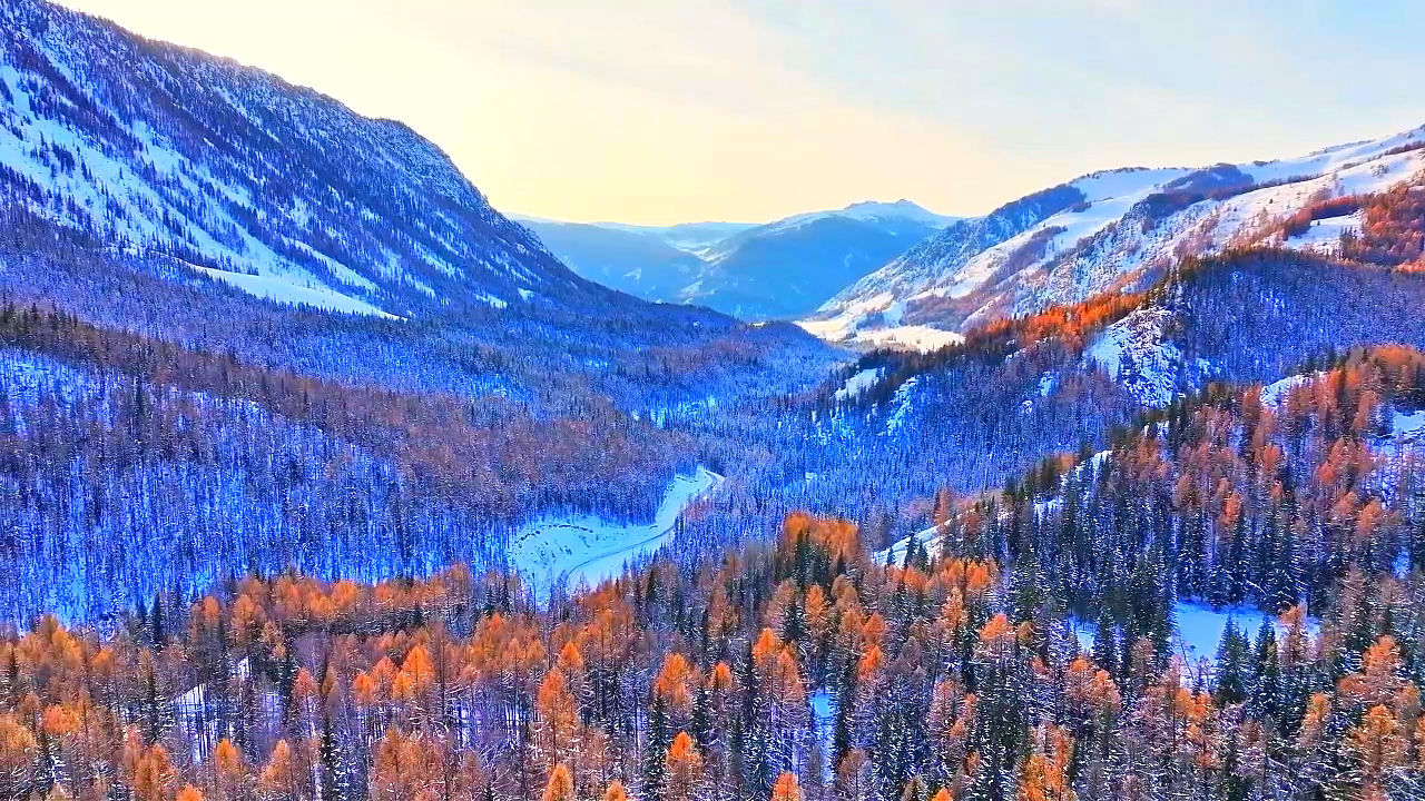 彩林漫山,公路在雪谷间绕出温柔弧线。