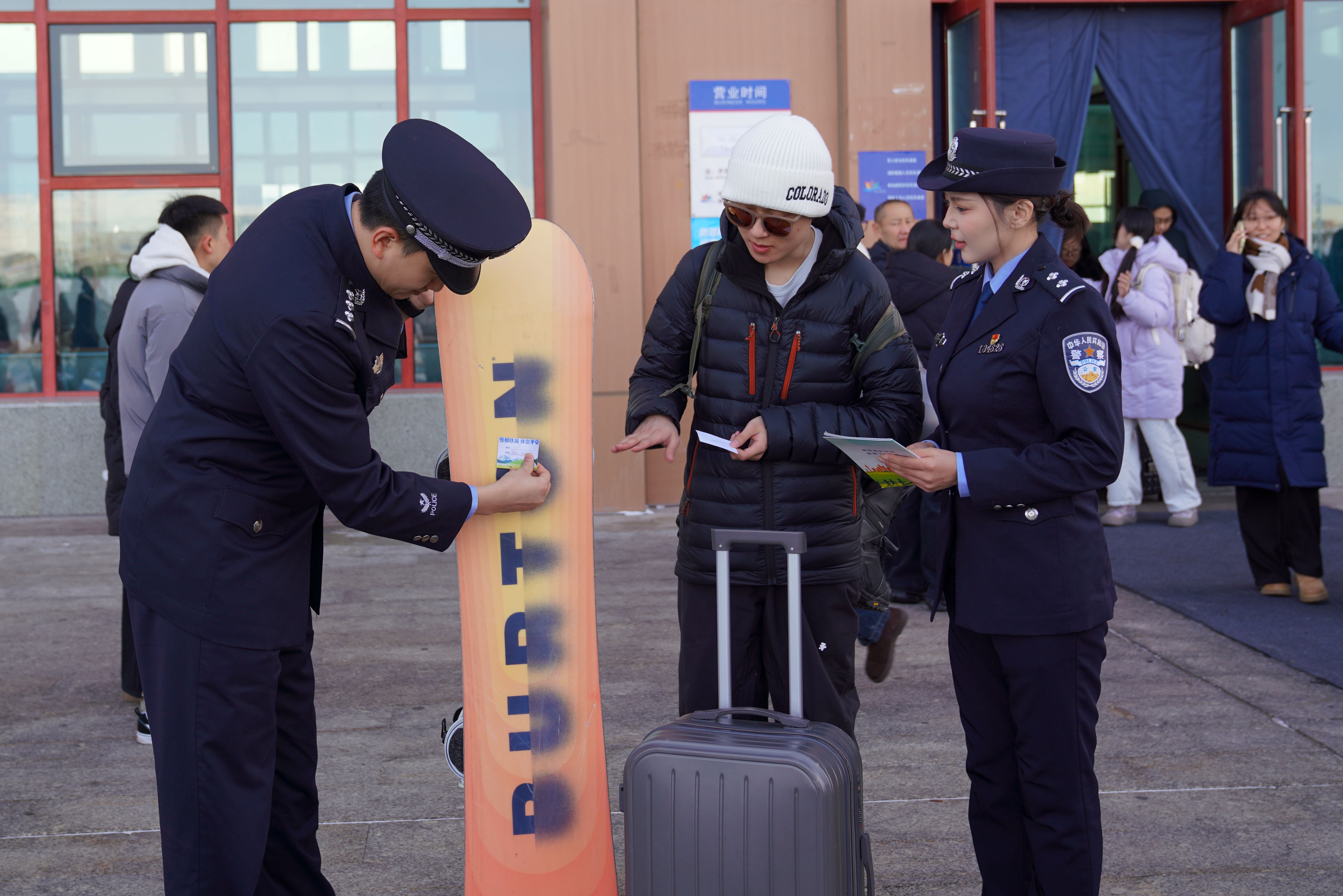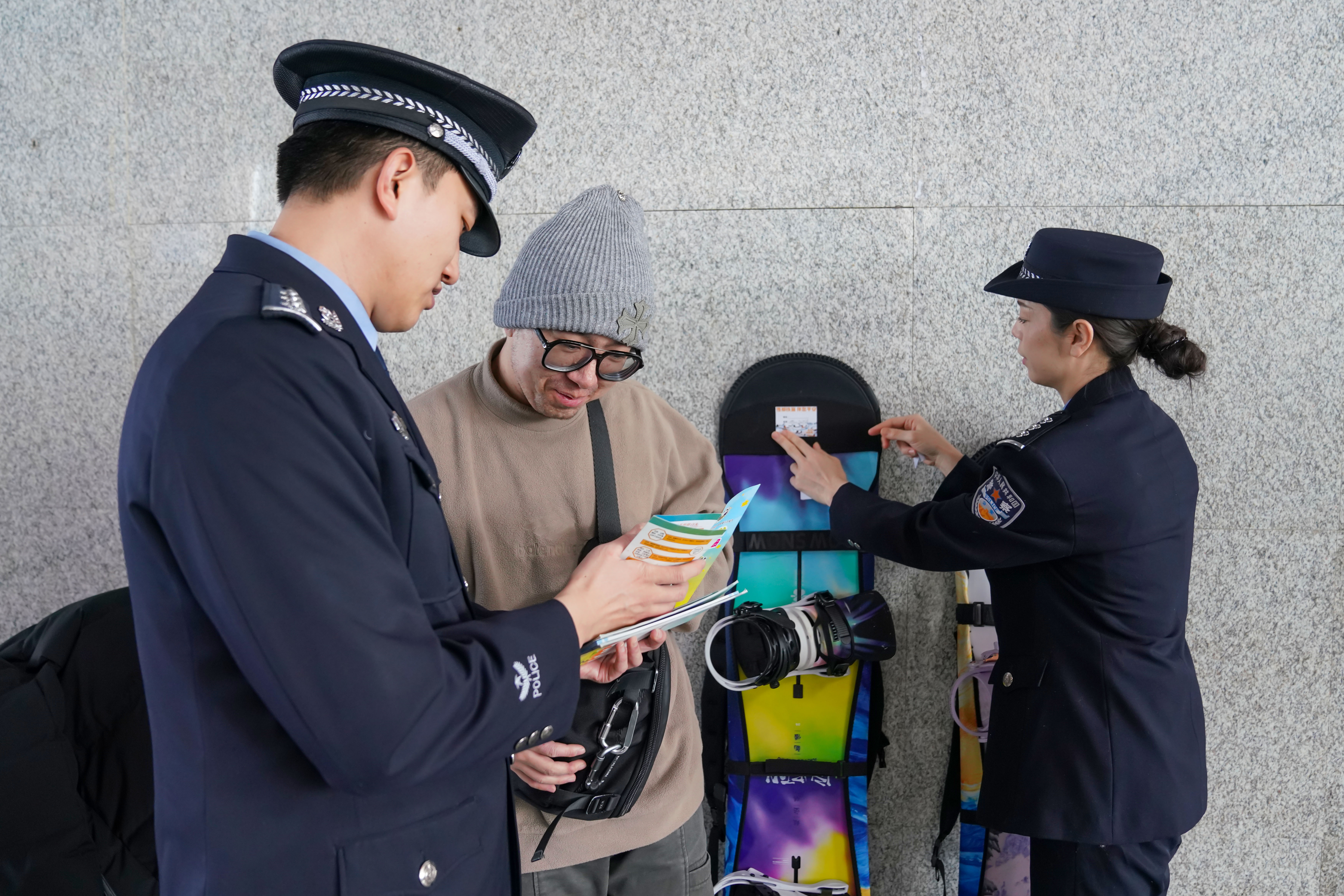 民警为旅客讲解出行安全提示,在旅客雪具上粘贴安全提示卡警民联系贴。通讯员 张艳军摄