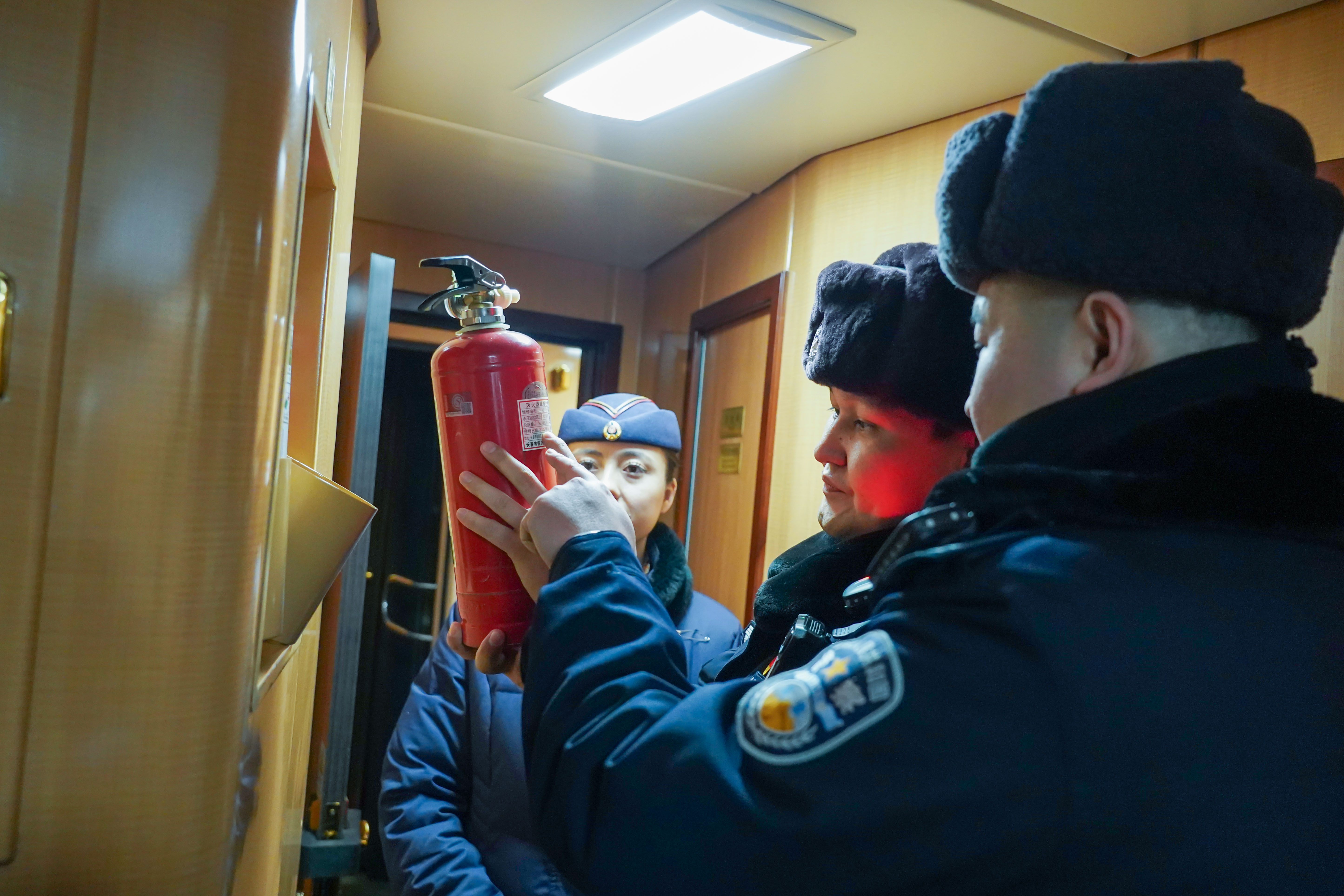 民警在“中国雪都·我的阿勒泰”列车上开展安全检查。通讯员 张艳军摄
