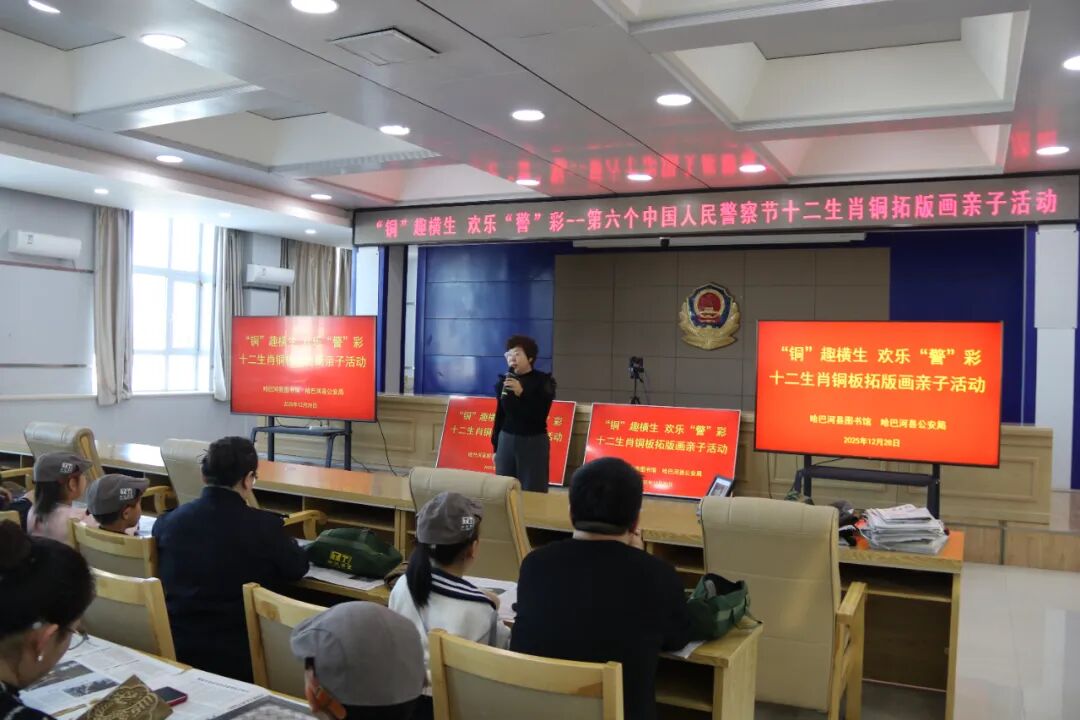 哈巴河县公安局联合县图书馆推出“‘铜’趣横生,欢乐‘警’彩”亲子活动。多组家庭齐聚一堂,民警们既用鲜活案例讲述平安守护的故事,又与图书馆工作人员一同指导亲子家庭体验铜拓版画非遗技艺,在文化浸润中拉近了警民距离,让“平安守护者”的形象更加鲜活可亲。