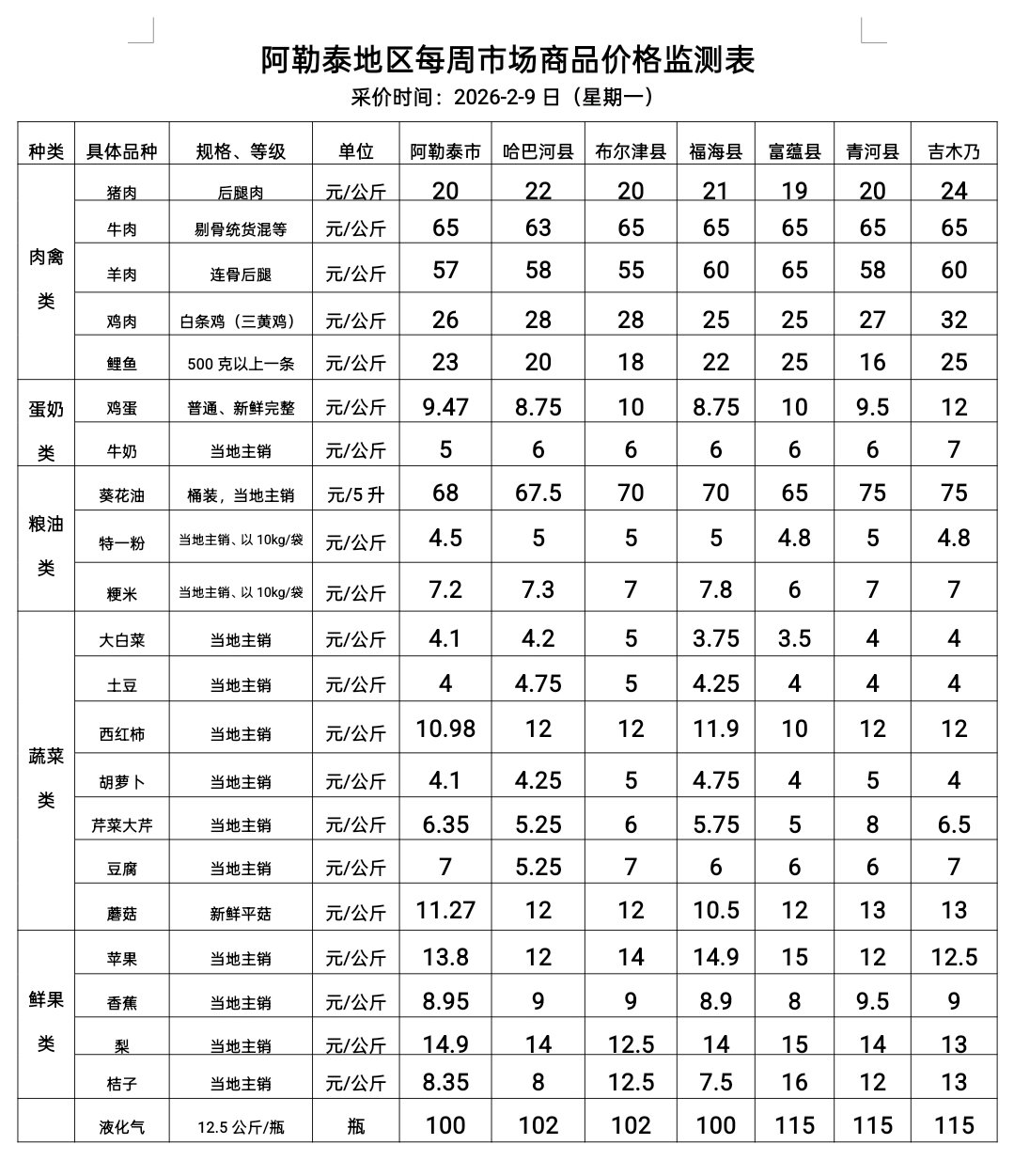 阿勒泰地区每周市场商品价格监测表