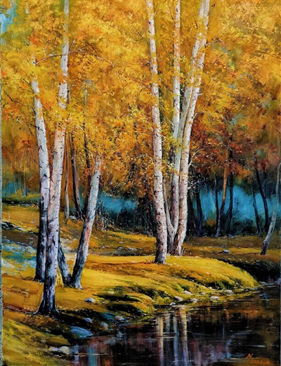 油画作品:《半是红叶半是黄,慢数流年赏秋光》