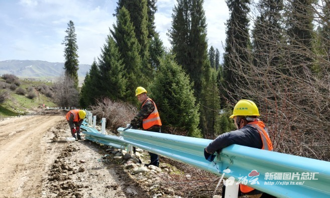 ?4月以来,S345线库尔德宁—恰西—塔里木—喀拉峻公路工程项目全面启动施工,图为工人们正在进行护栏拆除工作。伊犁融媒体中心供图
