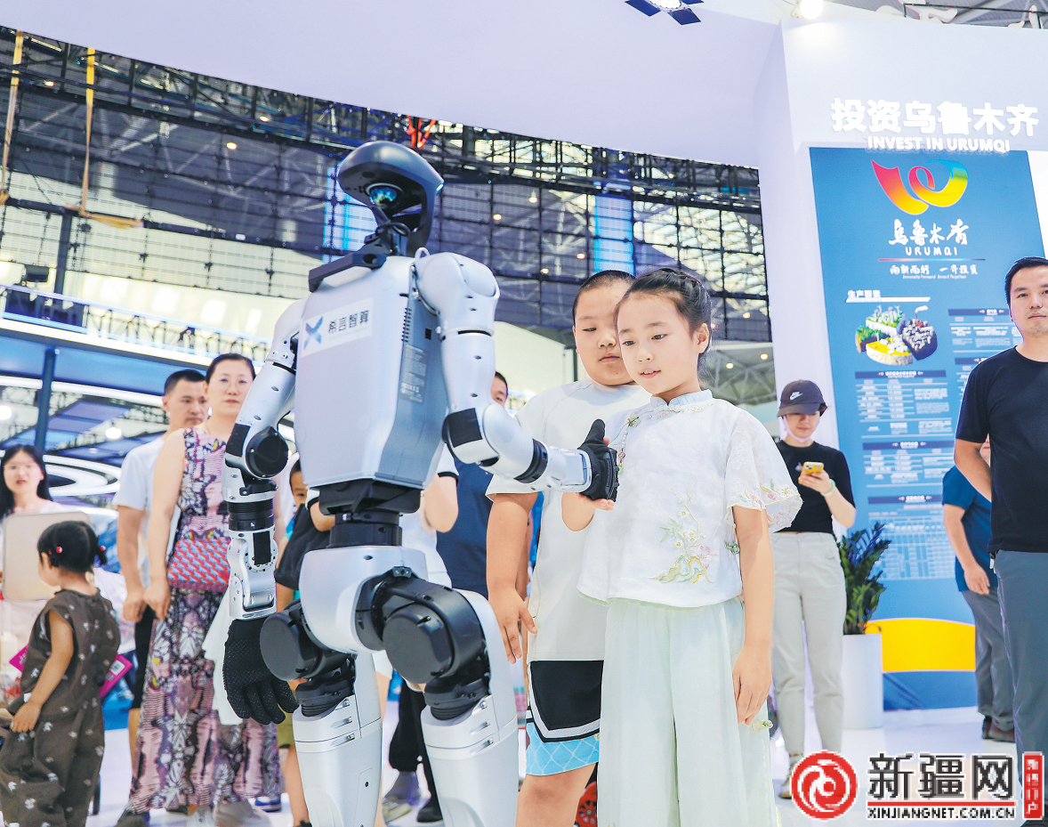 6月29日,乌鲁木齐展馆展示的智能机器人与小朋友互动。(记者米热扎提·木塔力甫摄)