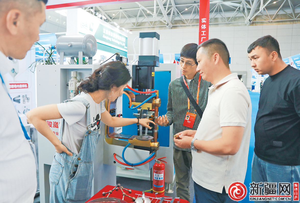 6月29日,在先进制造和新材料等新兴产业链展厅,参展商在给观众讲解中频点焊机的操作方法。(记者米热扎提·木塔力甫摄)