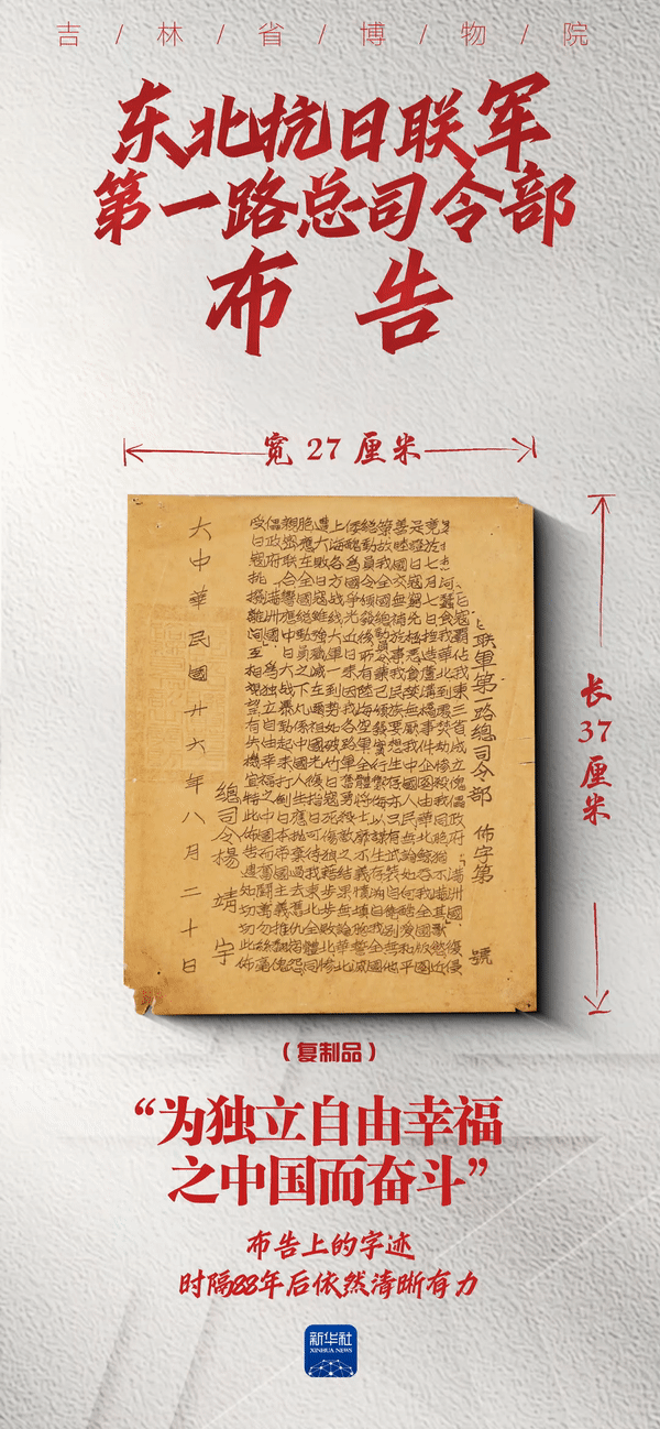 彼时,东北抗战如火如荼,“七七事变”爆发后,杨靖宇以东北抗日联军第一路军总司令的名义,发出这份布告,号召东北各族人民团结一致、驱除日寇。为配合关内抗战,在他的带领下,抗联将士们在南满地区积极开展抗日游击战,有力地牵制了日军兵力。两年以后,抗战的呐喊久久回响,而将军,却牺牲在了那个严冬。