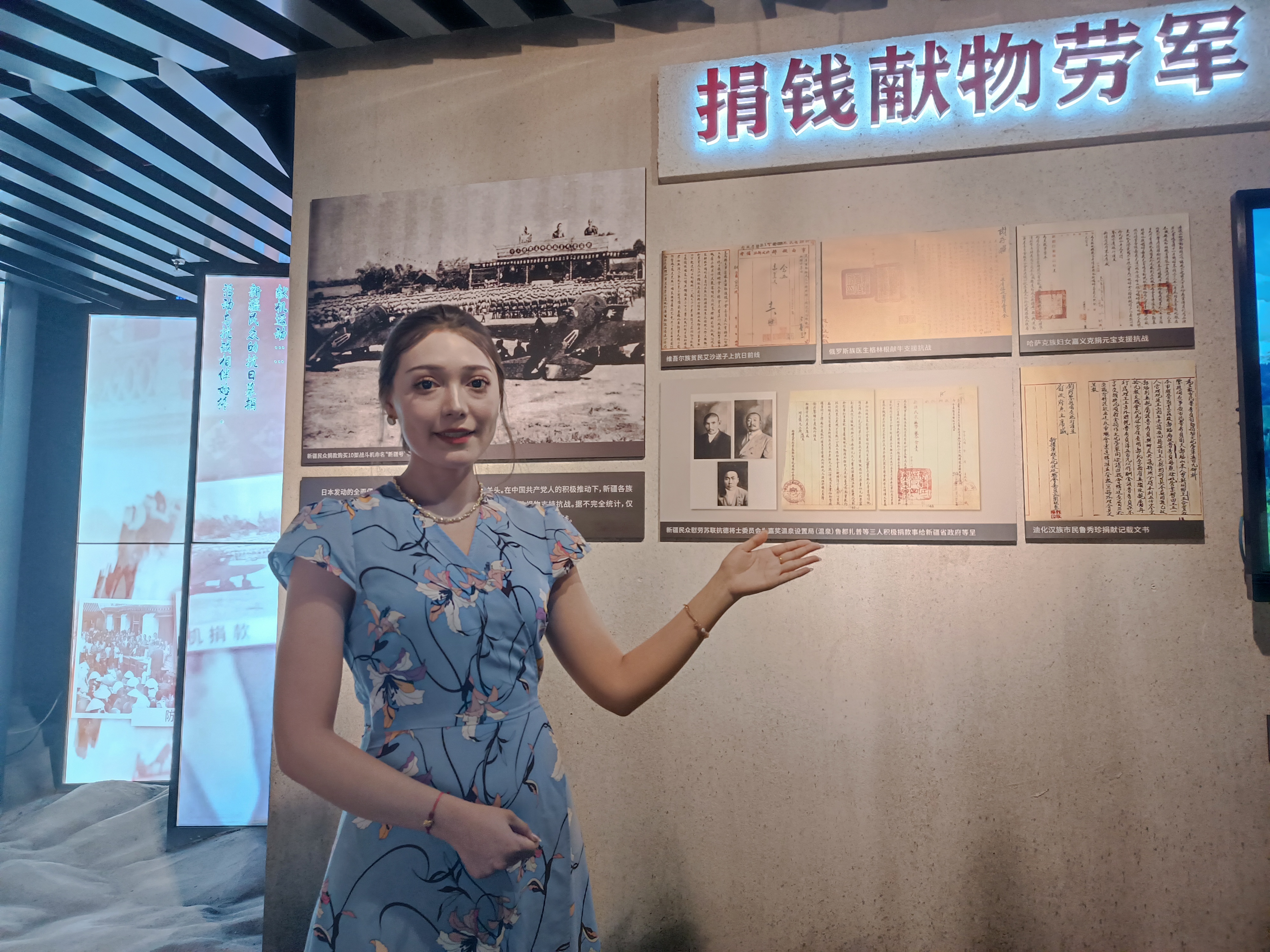 7月9日,在八路军驻新疆办事处纪念馆,讲解员正在讲解抗日战争时期新疆各族民众积极募捐的历史。石榴云/新疆日报记者 张冬梅摄