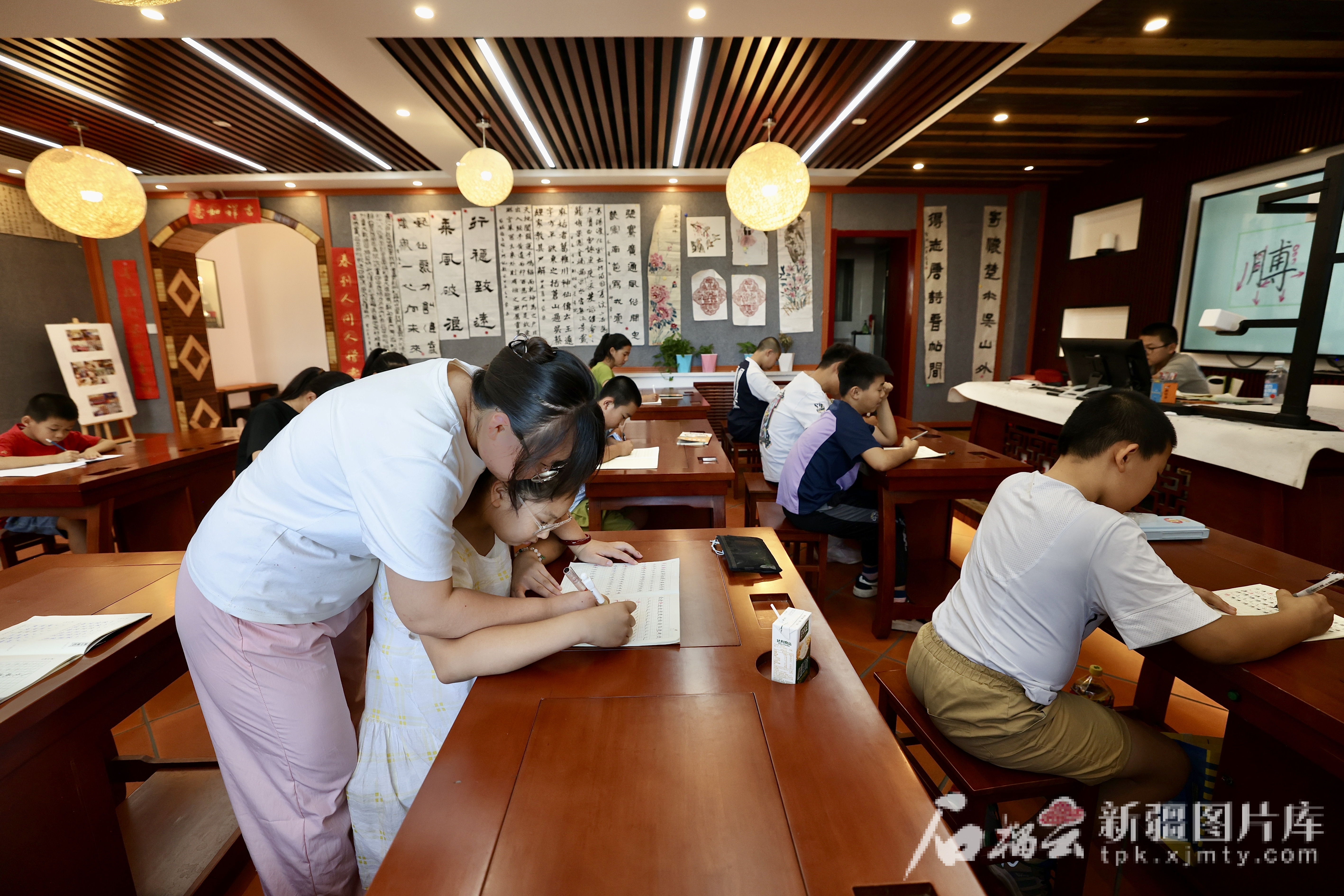 8月11日,刺桐国学书院二楼的书法室在举办暑期书法公益课堂,孩子们在老师的指导下认真练习书法。