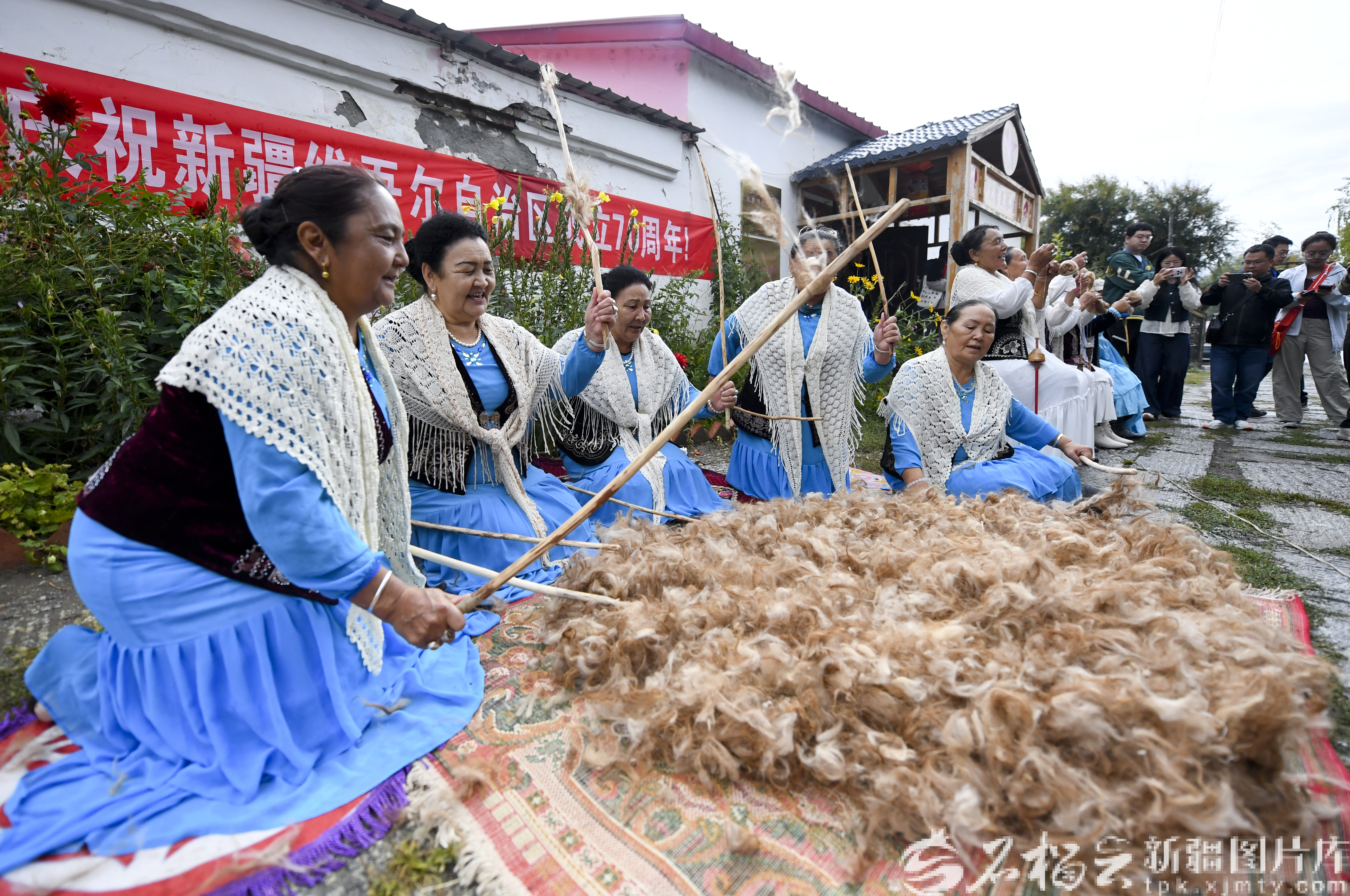 9月9日,村民们在“户儿家”文化大院打羊毛、捻线。