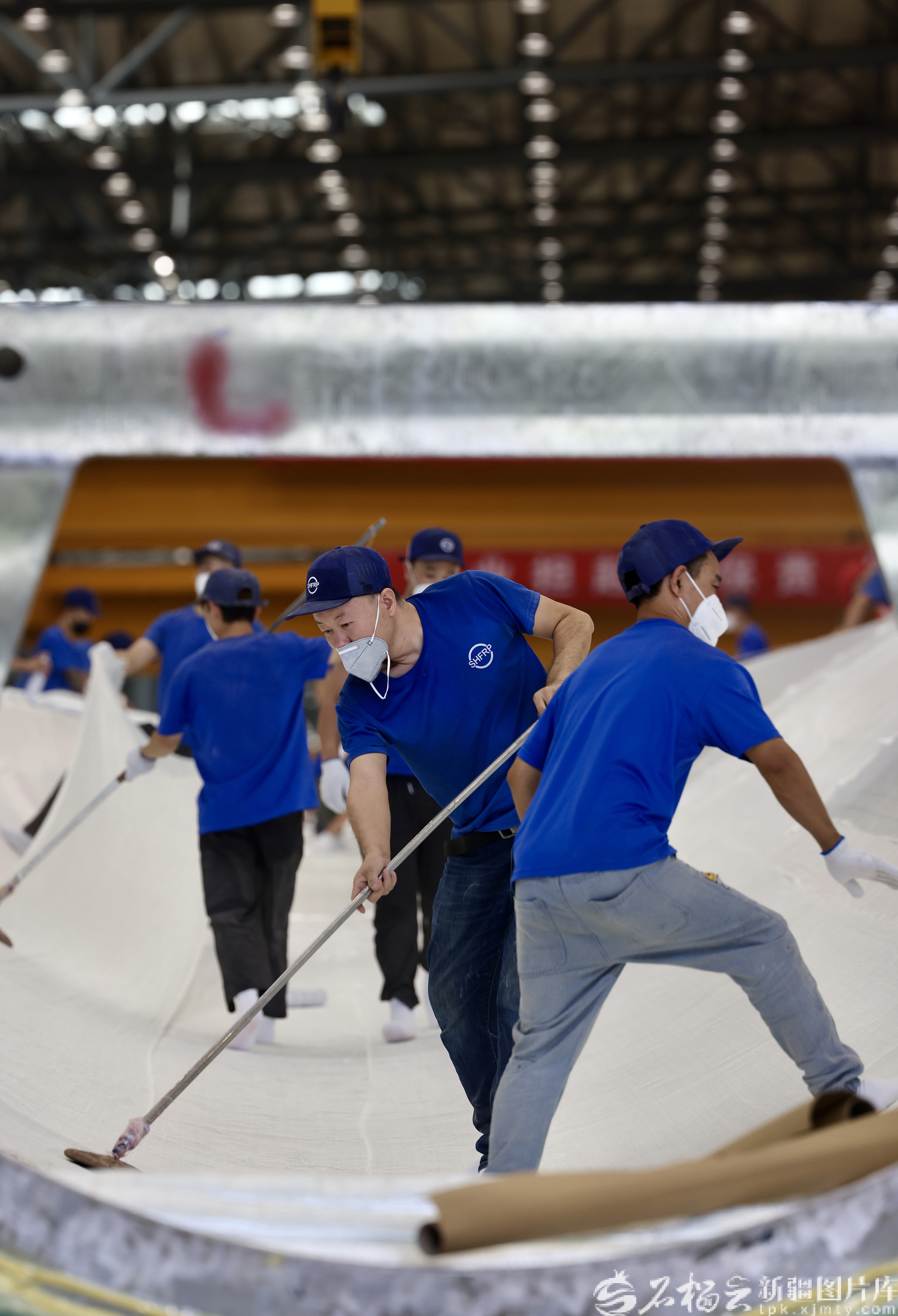 9月9日,粤新绿色(新疆)能源集团有限公司的风电设备生产车间,工作人员正在风叶生产线上作业。
