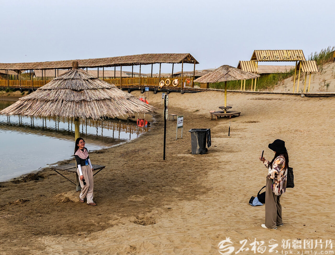 9月10日,游客在位于尉犁县墩阔坦乡的罗布人村寨景区拍照留念。