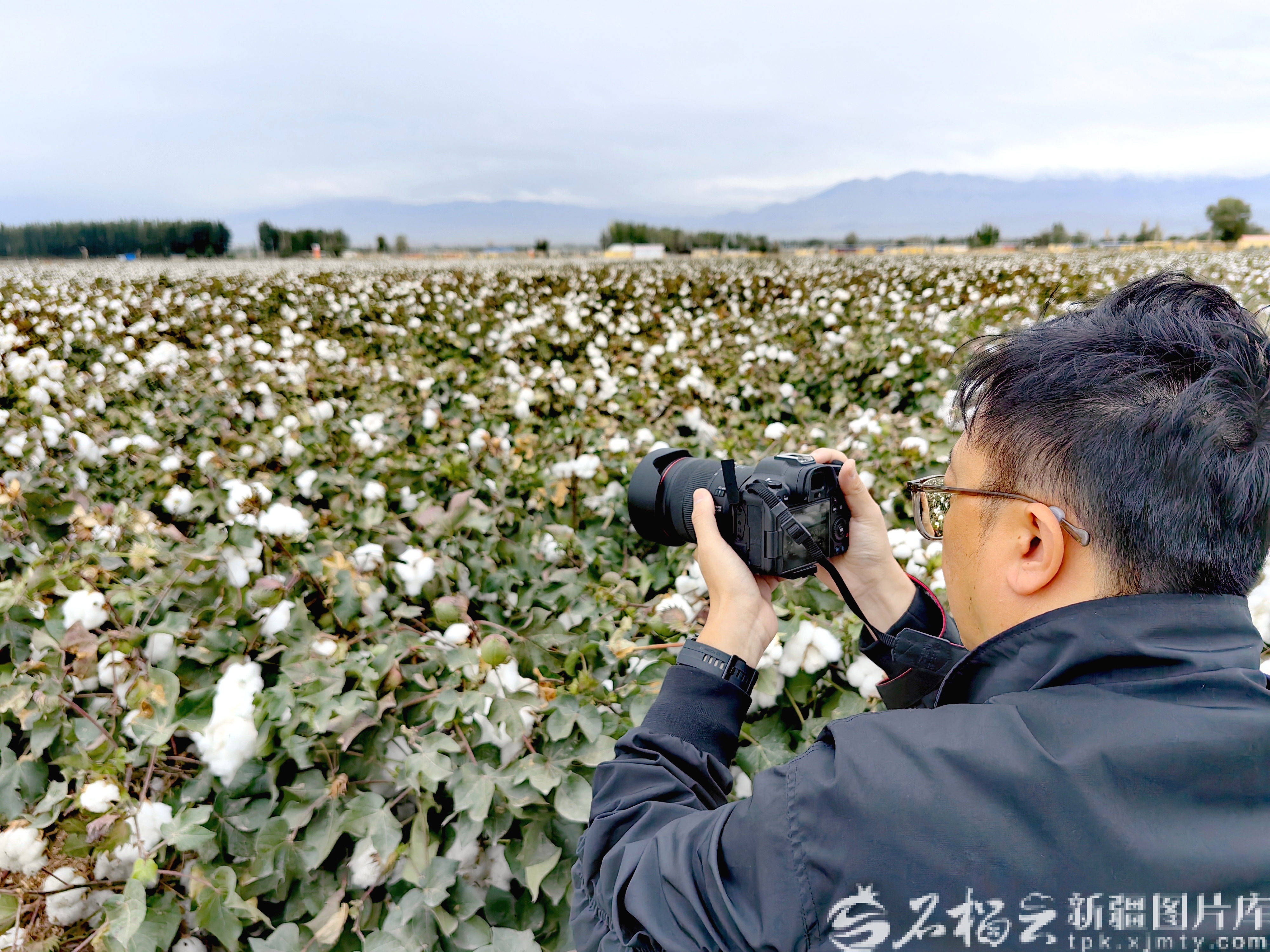 9月11日,采访团成员在精河县大河沿子镇夏尔托热村棉田拍摄。