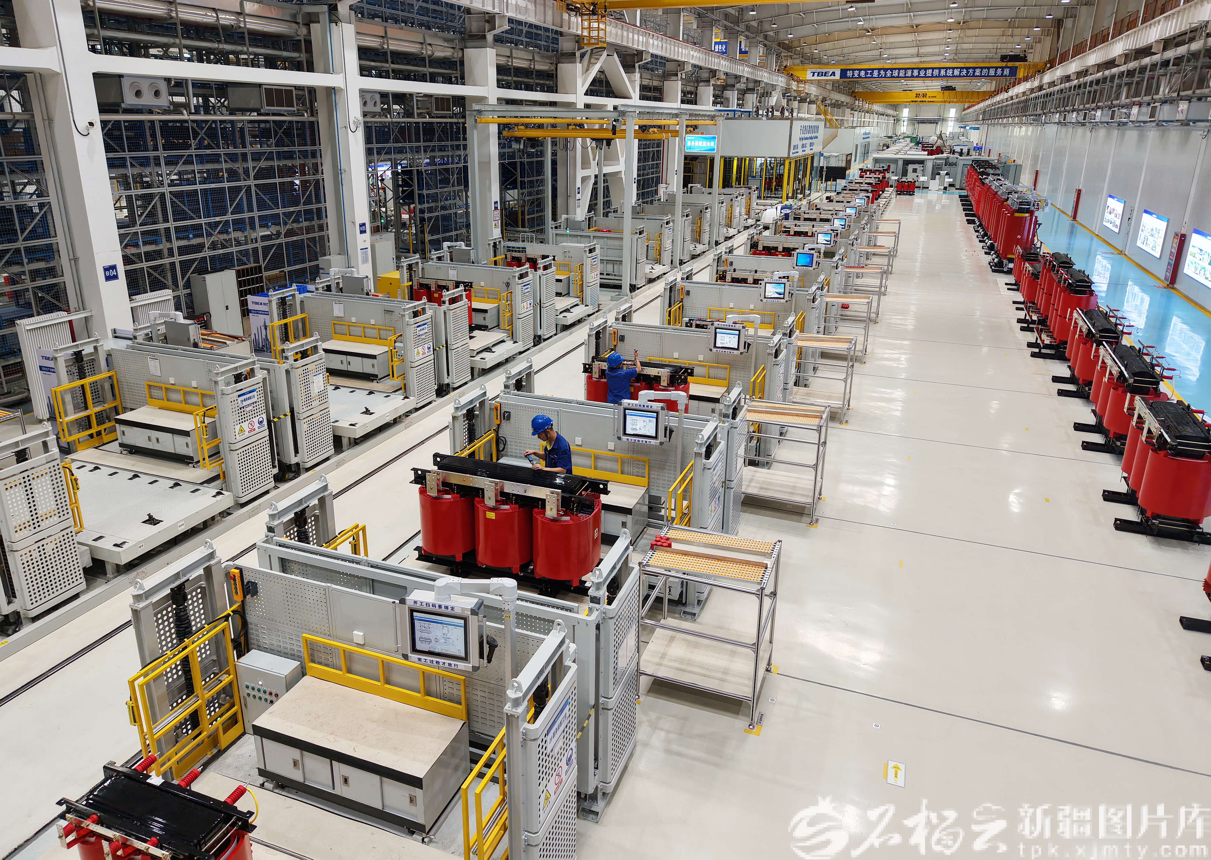 9月10日,工作人员在特变电工智能电气装备科技产业园智能电气数字化车间组装变压器。