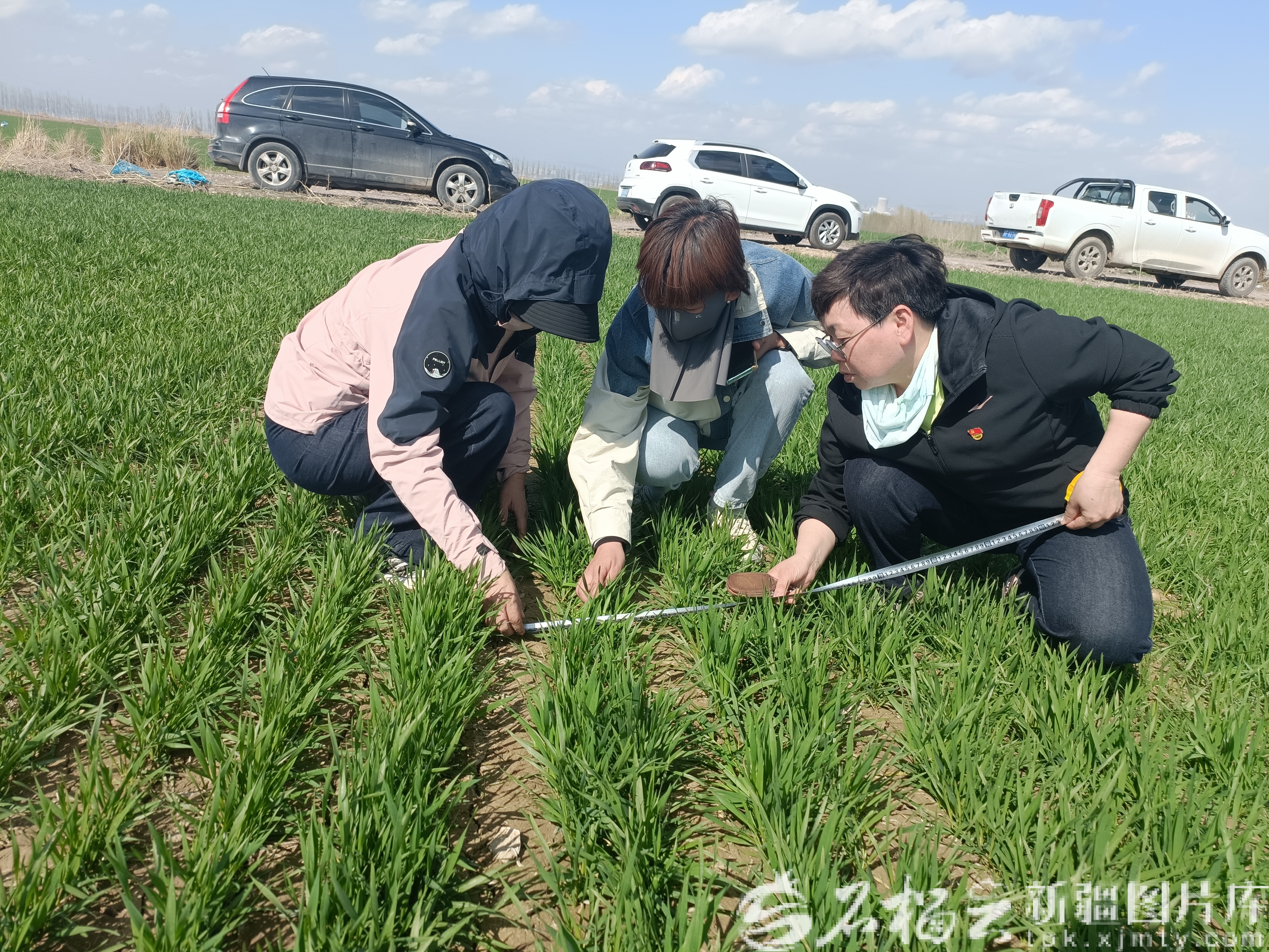 2025年4月13日,关丽菊(右)与同事进行小麦苗情调查。本人供图