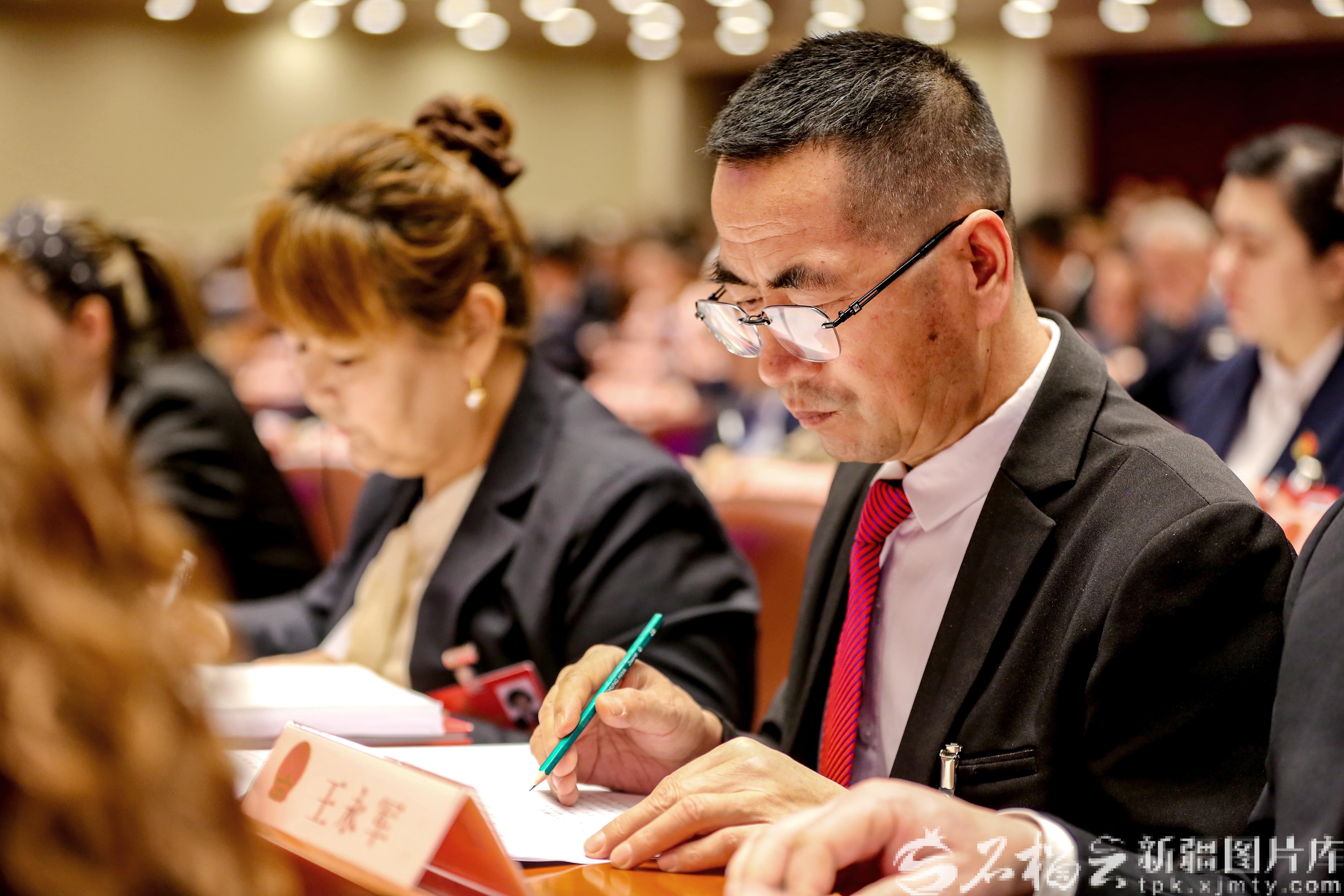 1月27日上午,自治区十四届人大四次会议在新疆人民会堂开幕。王永军代表(右)在听取政府工作报告。