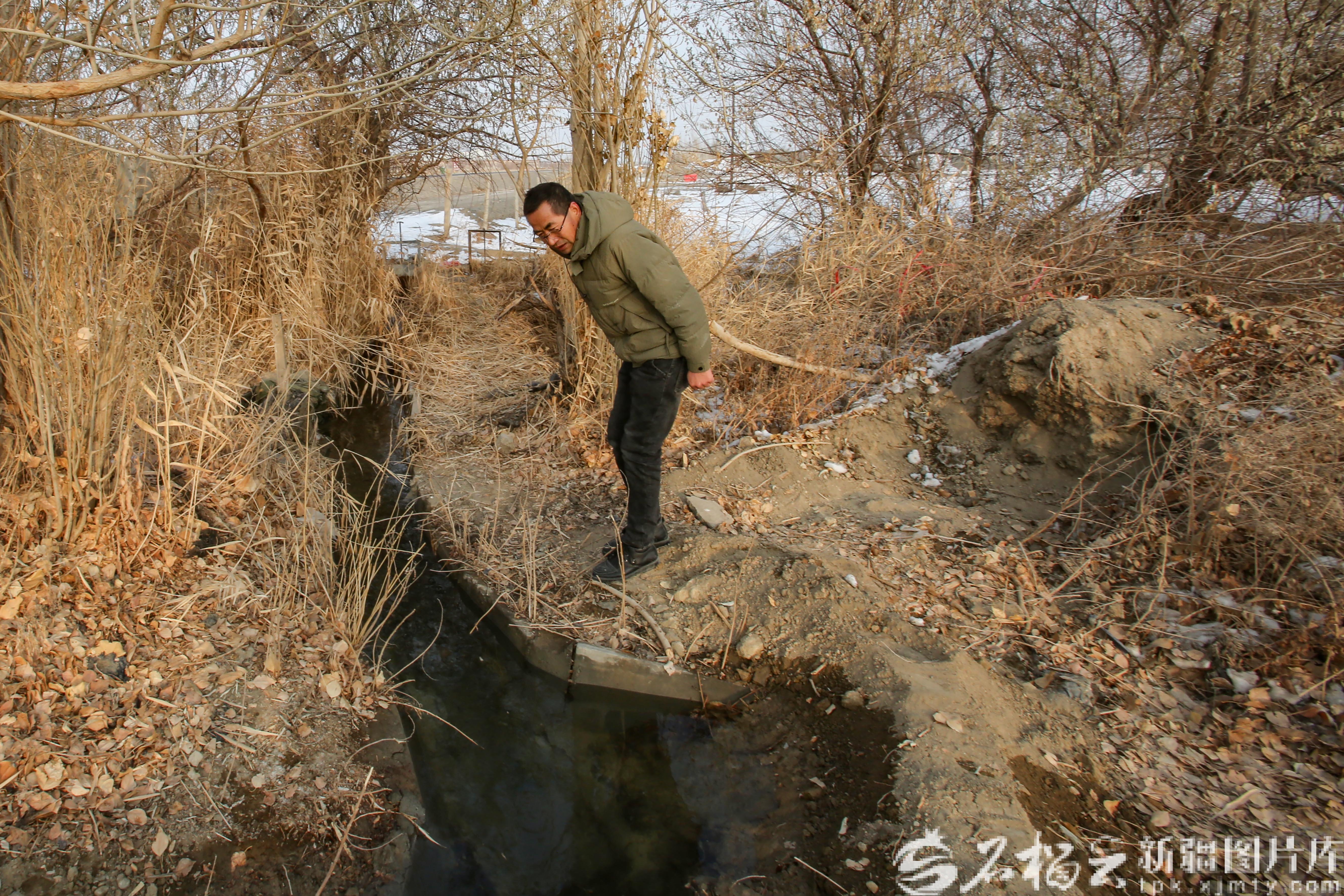 1月13日,王永军在哈密市伊州区二堡镇宫尚村的坎儿井出水口查看水流情况。
