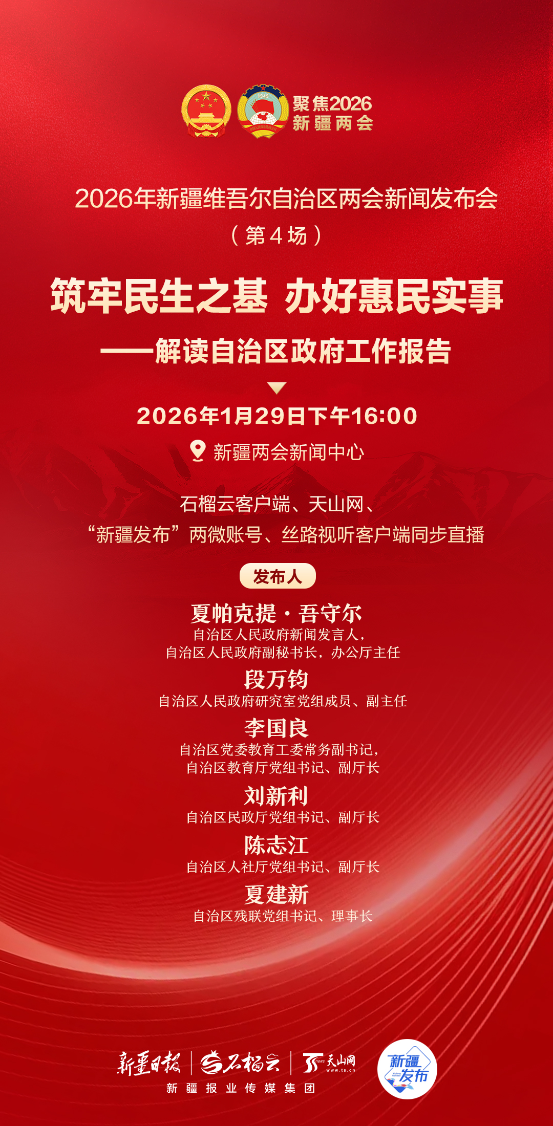 海报丨2026年新疆维吾尔自治区两会新闻发布会(第4?。┲蚊裆?办好惠民实事——解读自治区政府工作报告