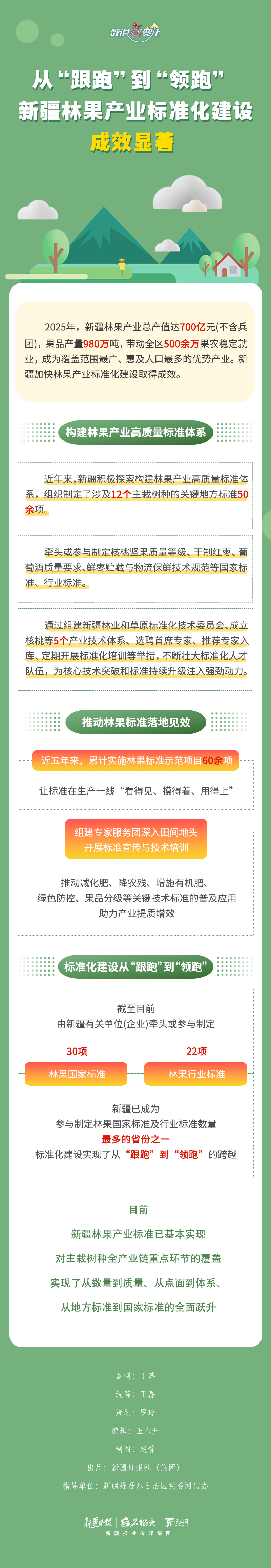 2025年,新疆林果产业总产值达700亿元(不含兵团),果品产量980万吨,带动全区500余万果农稳定就业。这一成果背后,是标准化、规?;肫放苹平募刑逑?。本期《数说“新”变化》为您解读新疆林果产业标准化建设的发展路径。